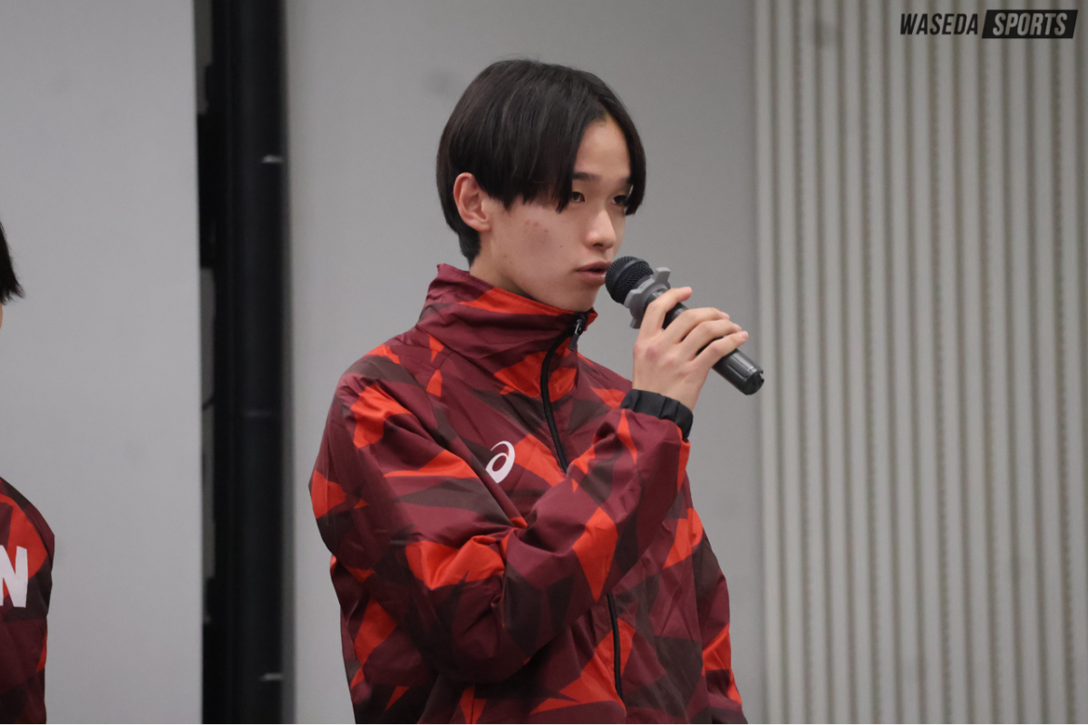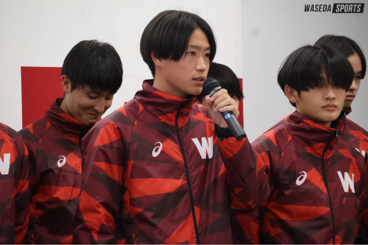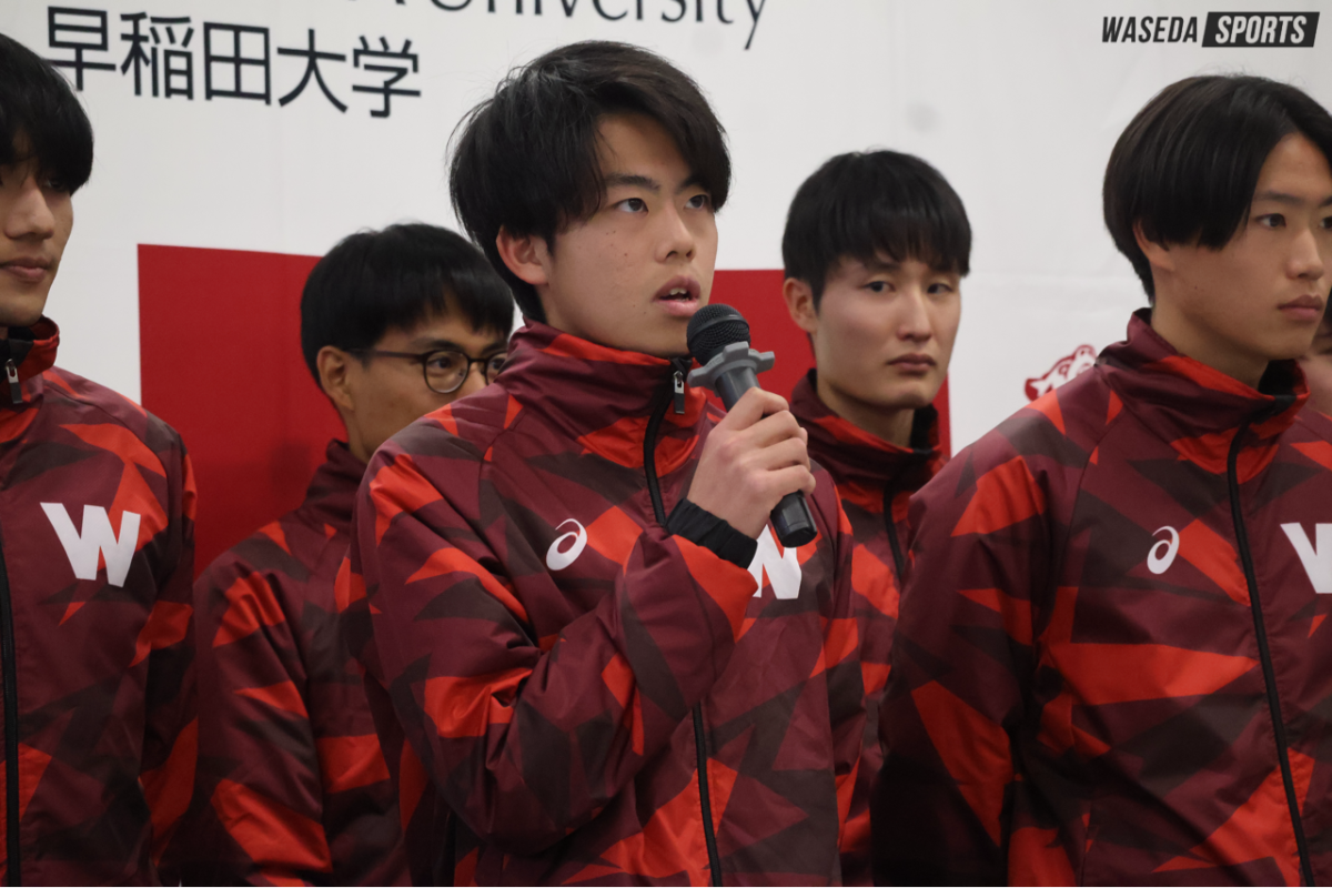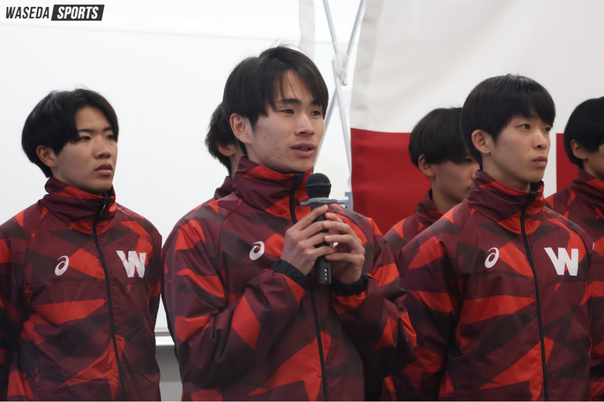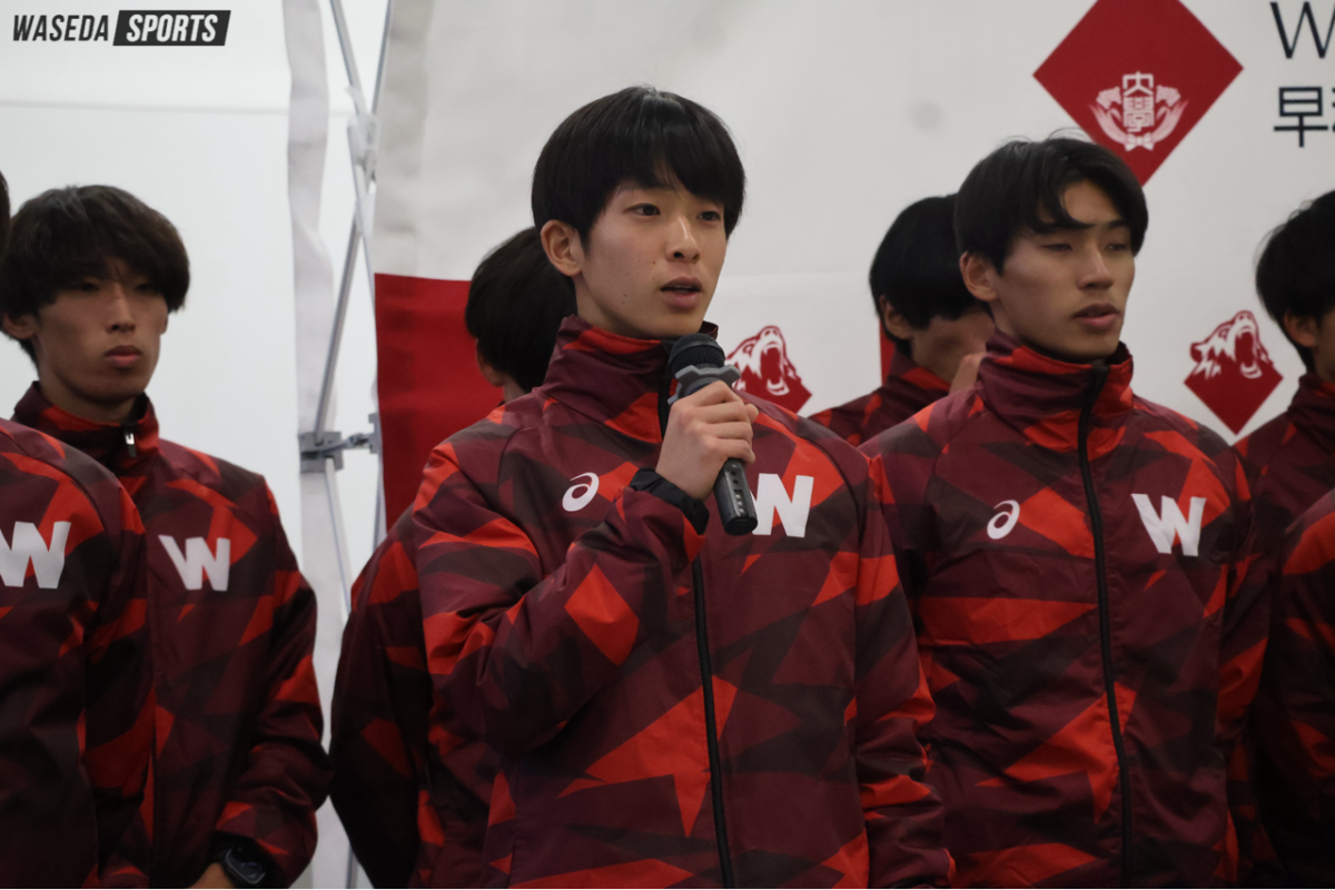 第101回箱根駅伝の報告会を大手町で行った時に、花田監督が(来年は)総合優勝をするとおっしゃって、このチームが発足しました。111代目ということで、1がそろう縁起のいい代です。『One早稲田』として選手はもちろん、白石(幸誠主務、人4=愛媛・八幡浜)をはじめとするスタッフ、または瀬古さん(瀬古利彦氏、昭55教卒)などOB会、クラウドファンディングなどで応援してくださる全ての方々とワンチームとなってこの1年間戦ってきました。出雲、全日本と優勝には届きませんでしたが、一学生の域を超えて、シニアで世界大会を目指すような選手、または早稲田実業高などの付属校から大学に上がってきて主力を担う選手、もしくは文武両道を極めている学生が出てきたということで、直近の早稲田とは違う「強い早稲田が帰ってきた」という証拠を見せることができたと思います。みんな状態が良いので、そこは期待してほしいと思います。箱根に向けて走る練習はもちろん、大手町で『都の西北』を今日よりもっと上手に歌えるように練習したいと思いますので、1月3日の大手町、楽しみにしていてほしいと思います。最後の箱根駅伝になるので、自分の4年間を最大限に表現して、1人でも多くの人たちがエンジに憧れるような1時間にできるように頑張っていきたいと思います。応援よろしくお願いします。