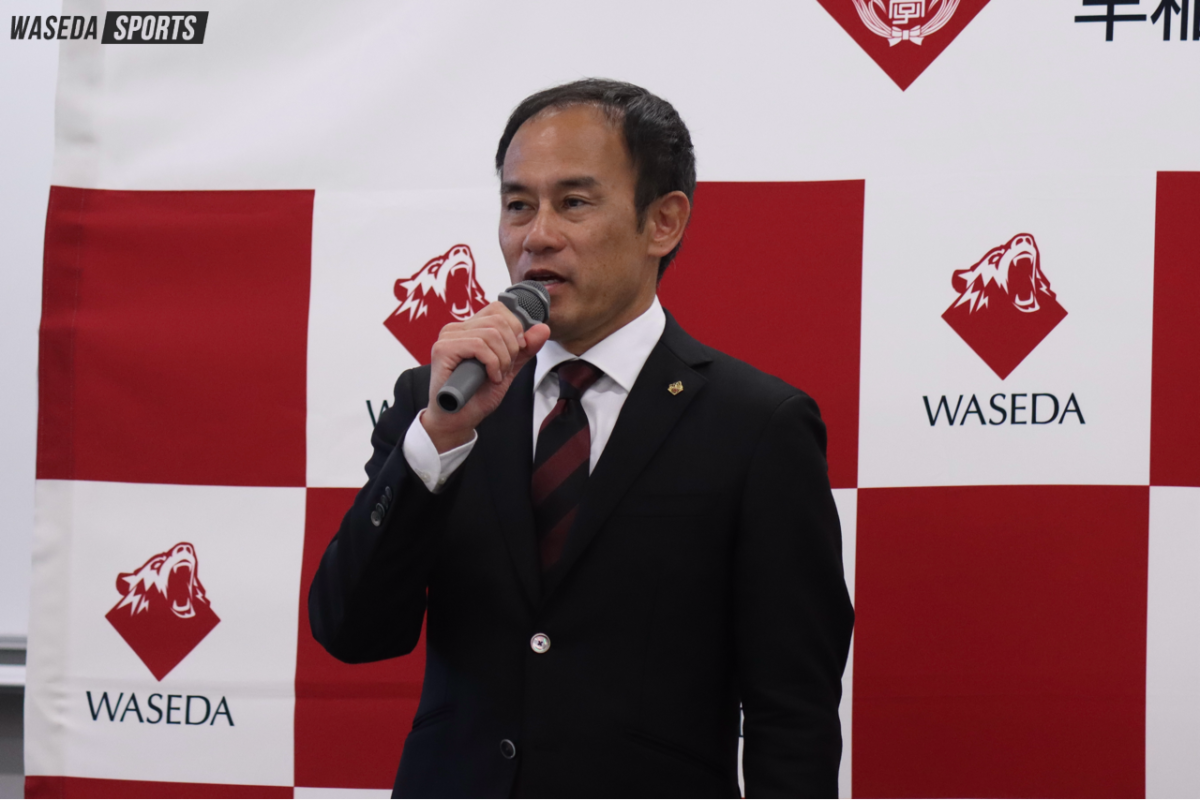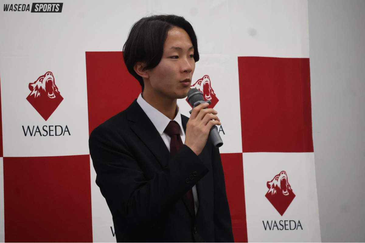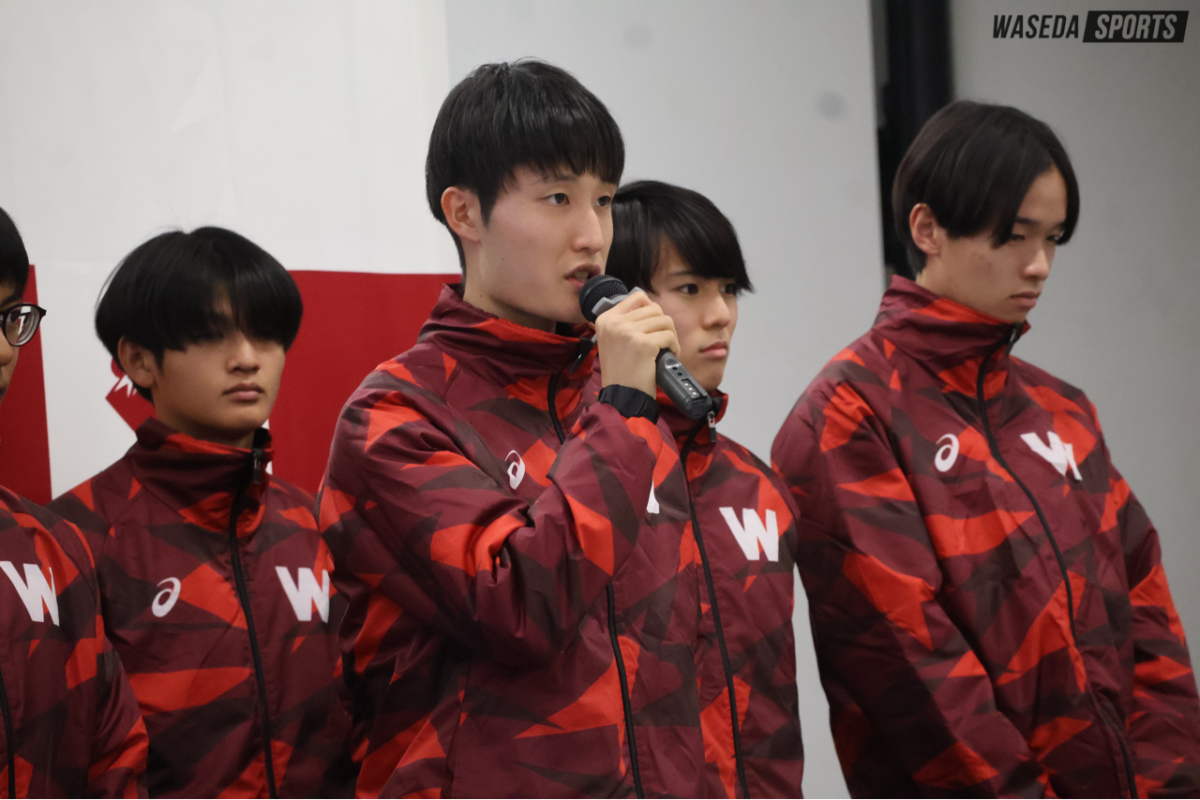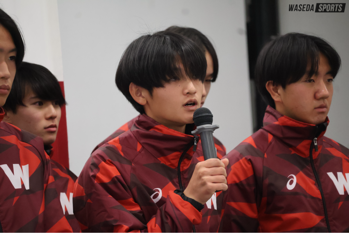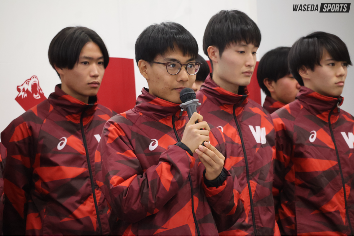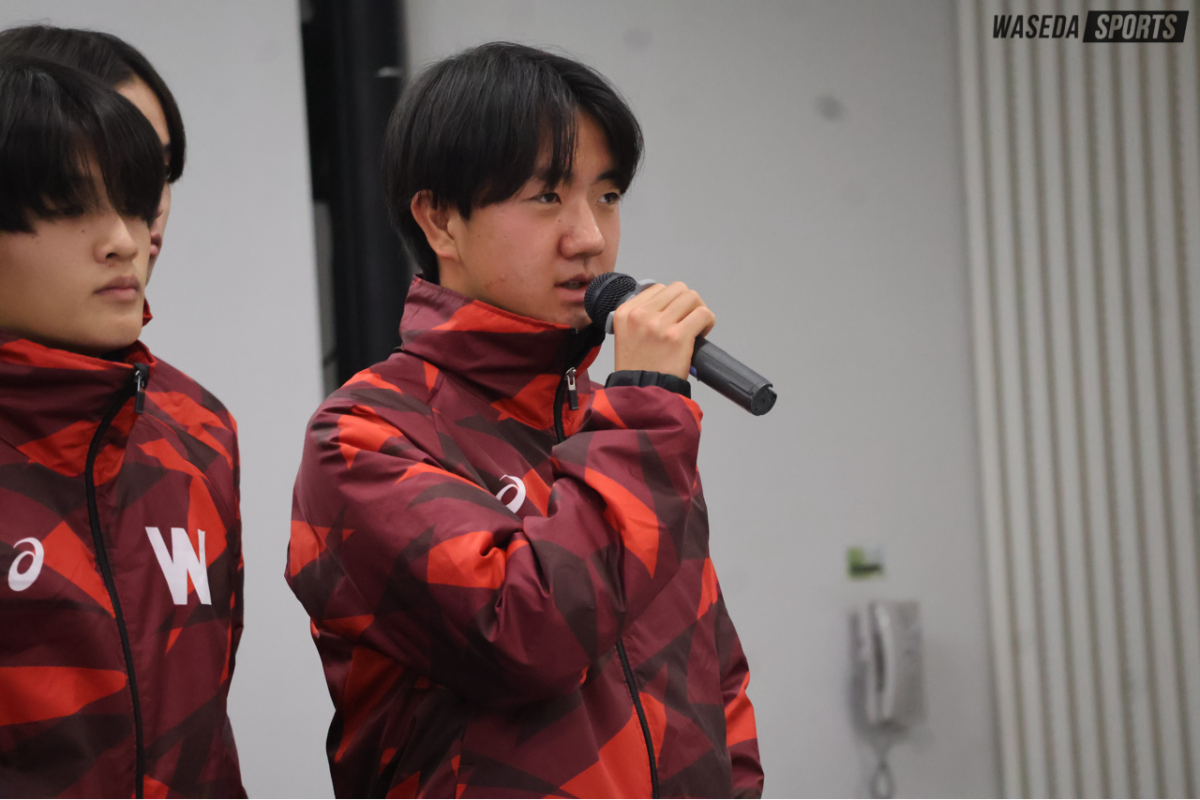 第101回箱根駅伝の報告会を大手町で行った時に、花田監督が(来年は)総合優勝をするとおっしゃって、このチームが発足しました。111代目ということで、1がそろう縁起のいい代です。『One早稲田』として選手はもちろん、白石(幸誠主務、人4=愛媛・八幡浜)をはじめとするスタッフ、または瀬古さん(瀬古利彦氏、昭55教卒)などOB会、クラウドファンディングなどで応援してくださる全ての方々とワンチームとなってこの1年間戦ってきました。出雲、全日本と優勝には届きませんでしたが、一学生の域を超えて、シニアで世界大会を目指すような選手、または早稲田実業高などの付属校から大学に上がってきて主力を担う選手、もしくは文武両道を極めている学生が出てきたということで、直近の早稲田とは違う「強い早稲田が帰ってきた」という証拠を見せることができたと思います。みんな状態が良いので、そこは期待してほしいと思います。箱根に向けて走る練習はもちろん、大手町で『都の西北』を今日よりもっと上手に歌えるように練習したいと思いますので、1月3日の大手町、楽しみにしていてほしいと思います。最後の箱根駅伝になるので、自分の4年間を最大限に表現して、1人でも多くの人たちがエンジに憧れるような1時間にできるように頑張っていきたいと思います。応援よろしくお願いします。