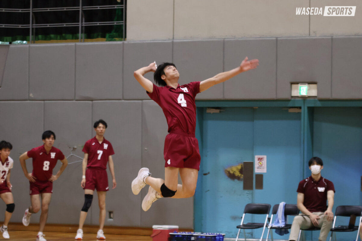 続く第2セットは相手の先制点から始まる。迫力のある小野のパイプやOH佐藤遥斗(スポ3=東京・駿台学園)のノータッチサービスエースが飛び出すなど、1セットめの流れを保ちつつ前半が終了。14ー8と6点差の場面では前田もサービスエースを獲得し、強気なサーブを武器に相手に攻撃させることすらも許さない。その後、後半にかけても板垣のAクイック、サービスエースを中心に得点し4年生としての背中を見せる。相手のミスもあり、リードを大きく保ったまま、佐藤のパイプでセットを終えた。