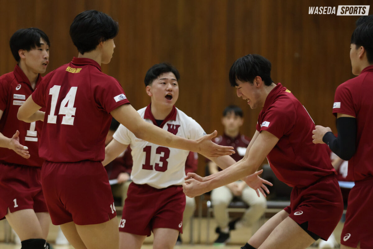 メンバーを大きく入れ替えて臨んだ第3セットは下級生を中心に声を出して盛り上げる。ローゼンのAクイック、徳留巧大(スポ2=長野・松本国際)のサービスエース、中上烈(スポ1=京都・洛南)の鋭いバックアタックなど瀬川桜輝(スポ1=宮城・東北)の巧みなトスワークで多方面から得点を重ねて5連続ブレイク。中盤には、梶村颯汰(スポ4=東京・安田学園)のレフトスパイクで18―9とダブルスコアに。その後も、相手に反撃の隙を与えることなく攻め続け、徳留のバックアタックでマッチポイントを握ると、最後は菅原啓(教3=山形南)のクイックが決まり、25―12でストレート勝利を収めた。