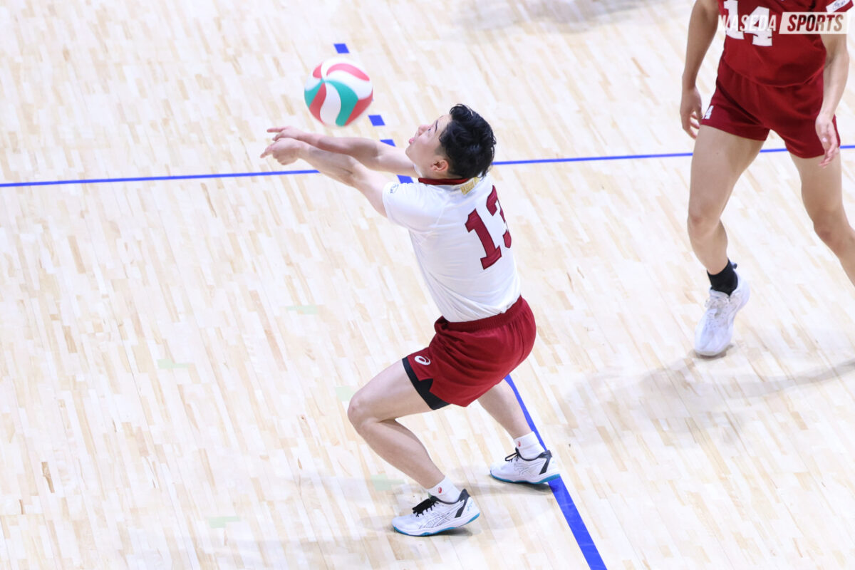 第2セット、両サイドを中心に攻撃を組み立てていく。相手守備の粘りや自分たちのミスなどで細かいブレイクが積み重なり、点差は徐々に開いてしまう。12ー15でタイムアウトを取ると菅原がクイックでブレイク。さらにローゼンのブロックで詰め寄るとサイドアウトの応酬で終盤へ。23ー24と相手がセットポイントの場面で小野がスパイクで得点しデュースに突入。ボールを託された小野の勢いは止まらず25点目を決めると、デュースの場面からコートに立った徳留巧大(スポ2=長野・松本国際)がディグを上げ、小野が打ち切り小野の3連続スパイク得点でセットを取り切った。