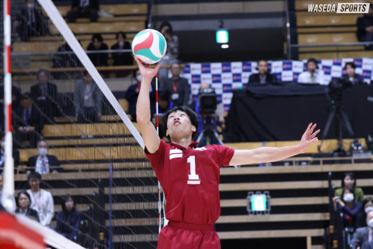 全日本大学選手権(全日本インカレ)決勝。1年間足掻いて、もがいて、悩み続け、努力を怠らなかった彼らにとって最高の舞台、センターコートでの試合だった。たくさんの観客が見守る中、対するは国士舘大。前日の準決勝では甲斐(専大4年)率いる専大を倒し、勢いのあるチームとの対戦となった。序盤こそ雰囲気に呑まれ崩されたものの、今までやってきたことをこなしていくことでリズムを掴んだ。最後は4年生がコートに立ち、感動のフィナーレを迎えた。セットカウント3ー0(25ー20、25ー18、25ー20)でストレート勝利を果たし、今大会すべての試合を失セット0で終え、無傷の優勝となった。