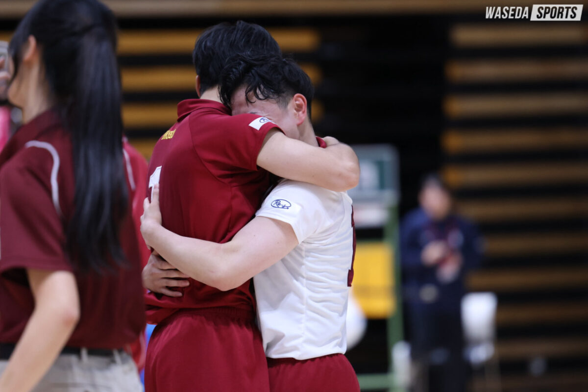3セット目はスタートから麻野堅斗(スポ3=京都・東山)を投入し、ブロックで相手を牽制する。ここで終われない国士舘大は最後の意地を見せ、序盤はお互いにサイドアウトを取り合う展開が続く。セッター前田凌吾主将(スポ4=大阪・清風)は、2セット目での相手セッター竹松(国士舘大2年)のスパイクに応戦するかのように、ネット際に上がった2本目のボールを打ってブロックアウトを獲得した。麻野のCクイックを中心に多彩なコンビバレーを展開するが、点差は動かず終盤へ。プレッシャーに耐えかねた相手がアウトを連発し、加勢するように麻野がサービスエースを決める。24ー18の場面で4年生の梶村颯汰(スポ4=東京・安田学園)、板垣慧(政経4=京都・洛南)がコートに立つ。後輩たちがベンチから見守る中、最後は板垣が前田と息を合わせクイックを決め切り、悲願の優勝を勝ち取った。
