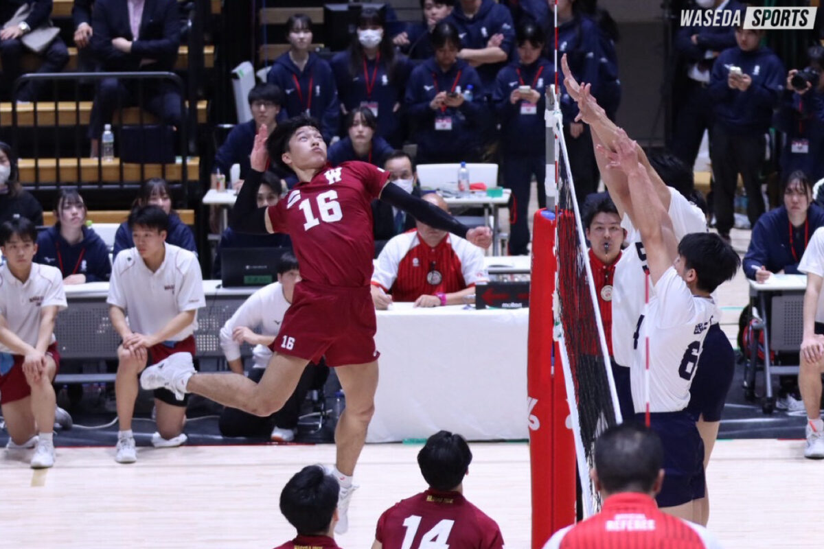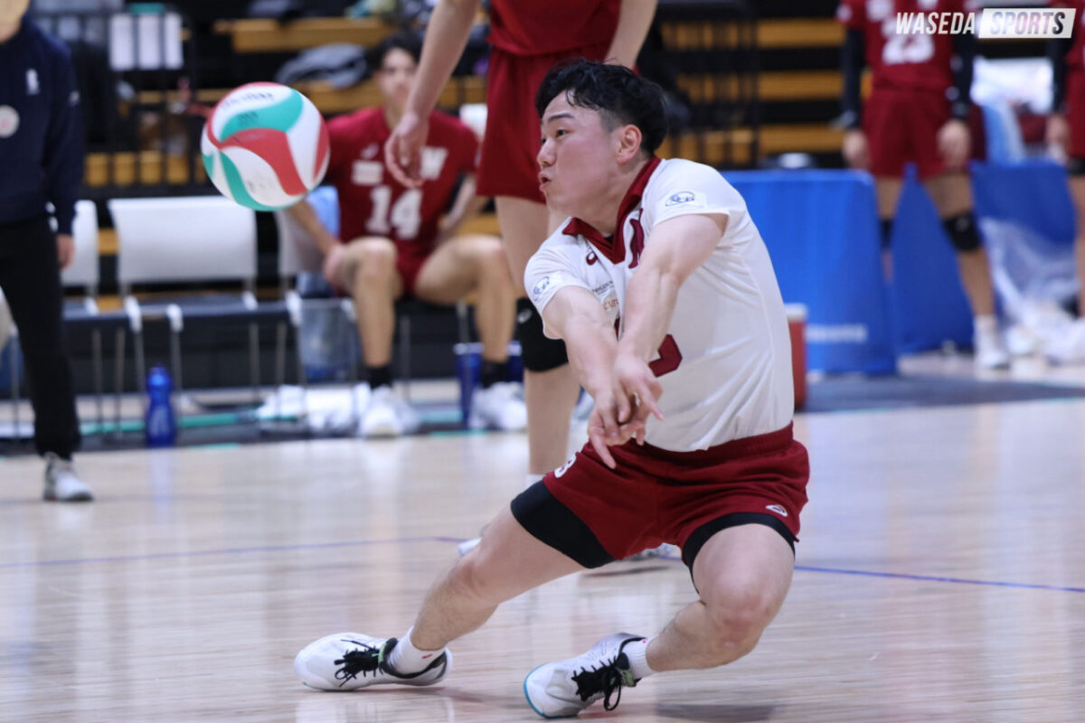 ローゼンのブロック得点から始まった2セット目は徐々に相手のAクイックに順応し、早大のペースに持ち込んだ。序盤からミドル陣のクイック、サイド陣の個性際立つ攻撃を組み合わせながら得点を重ねる。7ー6の場面では徳留巧大(スポ2=長野・松本国際)がノータッチサービスエースを決め、勢いを加速させた。相手の攻撃が決まっても取れるボールを確実に拾いきり、冷静さを忘れない。OP川野琢磨(スポ1=東京・駿台学園)の強烈なスパイクや、相手コートの空間を目掛けたMB菅原啓(教3=山形南)のクイックが決まり、リードを保つ。15ー13の場面から菅原のクイックを中心に畳みかけるように4連続得点を獲得した。終盤は小野がサービスエースを含め4得点に貢献し、 25ー18と相手を寄せつけることなくセットを連取した。