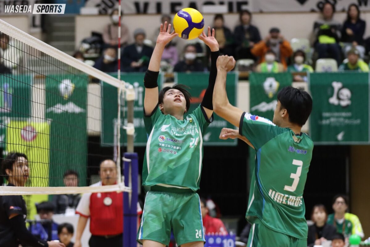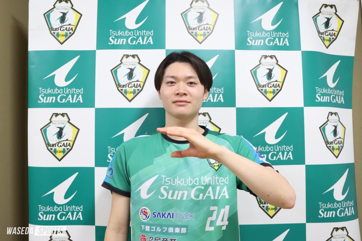 卒業してから約10ヶ月。早大OB浅野翼(令7スポ卒=現つくばユナイテッドSun GAIA)は茨城県つくば市に本拠地を置く、 V.LEAGUEのつくばユナイテッドSun GAIA(サンガイア)でプレーをしている。現在シーズン中盤で、東地区では9チーム中2位と目標であるセミファイナル進出に向かって着実に突き進んでいる。今試合は、現在5位の埼玉アザレアとの対戦だった。1、2セット目では、盤石な試合運びでセットを連取する。しかし、3セット目終盤に相手の高い打点から放たれるスパイクに苦戦し、セットを献上した。4セット目では互いにレシーブの応酬となるもブロック得点を中心に相手を追い込み、セットを奪取して勝利した。