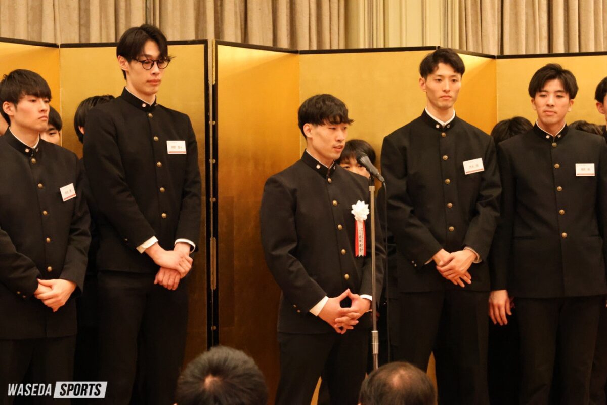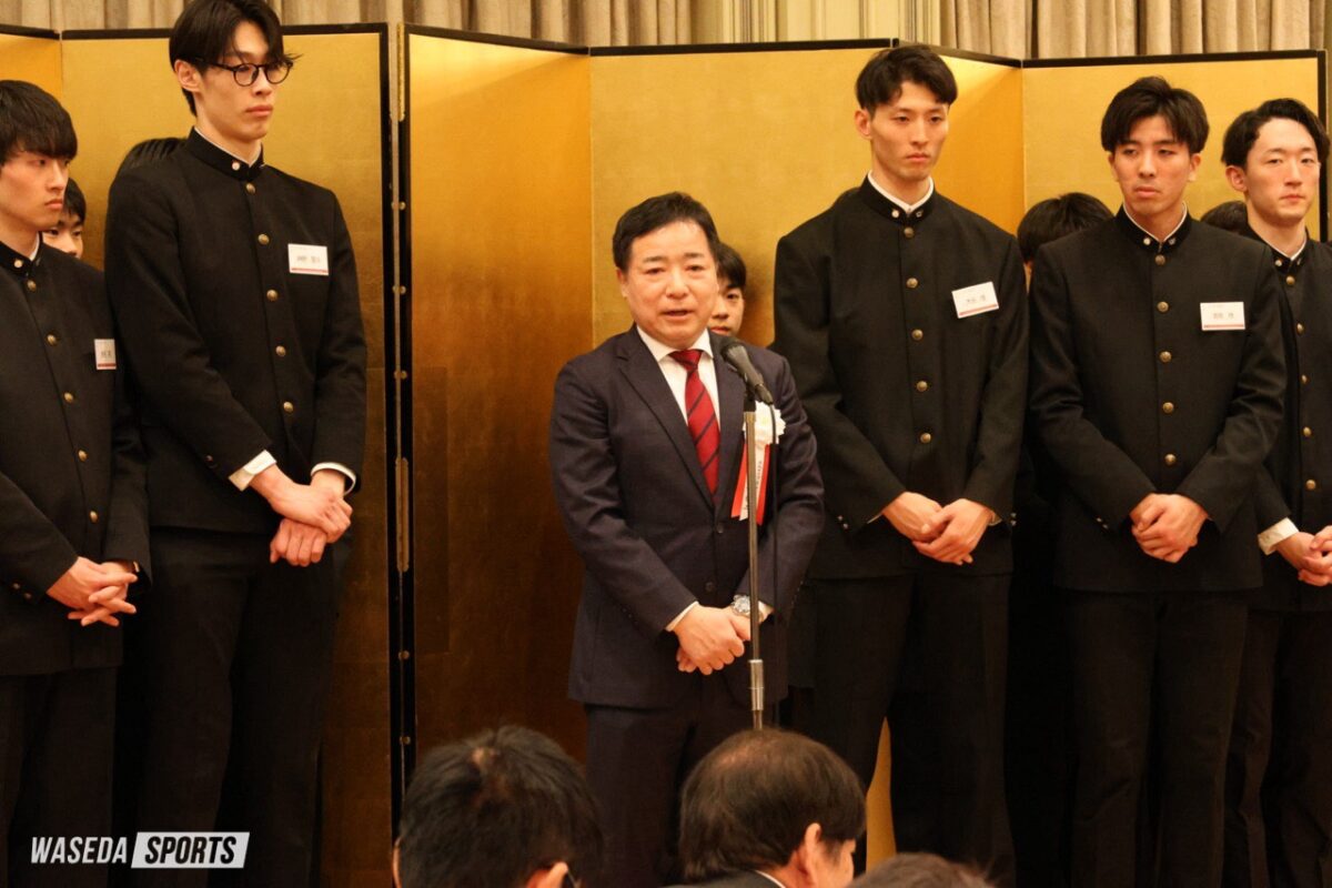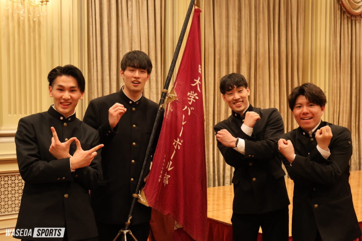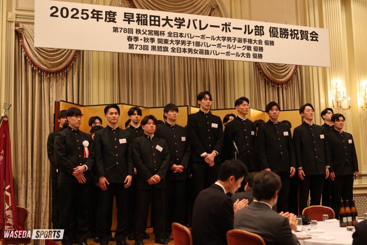 2025年度の活躍を振り返る祝賀会が行われた。今年度男子バレーボール部は、春季・秋季関東大学リーグ戦、黒鷲旗、全日本大学選手権(全日本インカレ)で優勝を収め、OBや関係者がその功績をたたえた。ここでは松井監督と前田前主将のコメントを紹介する。