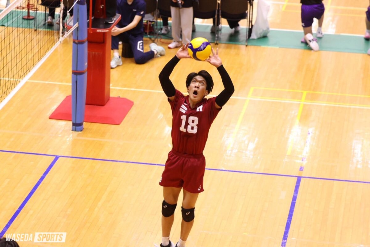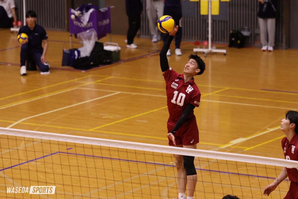 第2セット、セッター瀬川桜輝(スポ2=宮城・東北)がネット際に上がったボールをトスにせず、そのまま返球するトスフェイントの形で得点。立て続けに小野が2連続サービスエースを決め、徳留の冷静なストレートへのコース打ちとブロックアウトで序盤から大きく点差を開く。MB麻野堅斗副将(スポ4=京都・東山)が相手クイックを跳ね返し、バックアタックを叩き落とすなど2連続ブロックポイントで11―3となりさらにタイムアウトを取らせる。その後も小野のスパイクや中上のバックアタックで得点を重ね、ブロックタッチを取って切り返し小野のサーブ時に5連続得点で大きく突き放す。中上のエンドライン際に落とすサービスエースや、關屋幸馬(スポ1=静岡・浜松修学舎)のディグから工藤文将(スポ2=東京・早実)がブロックに当てて外に出し得点するなど交代で入った選手も活躍し勢いを維持する。最後は相手のサーブがミスとなり25―12でセットを取った。