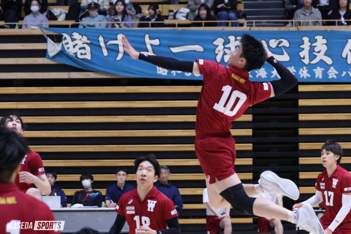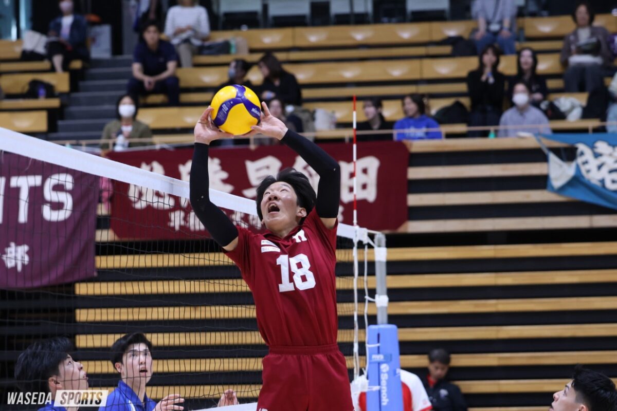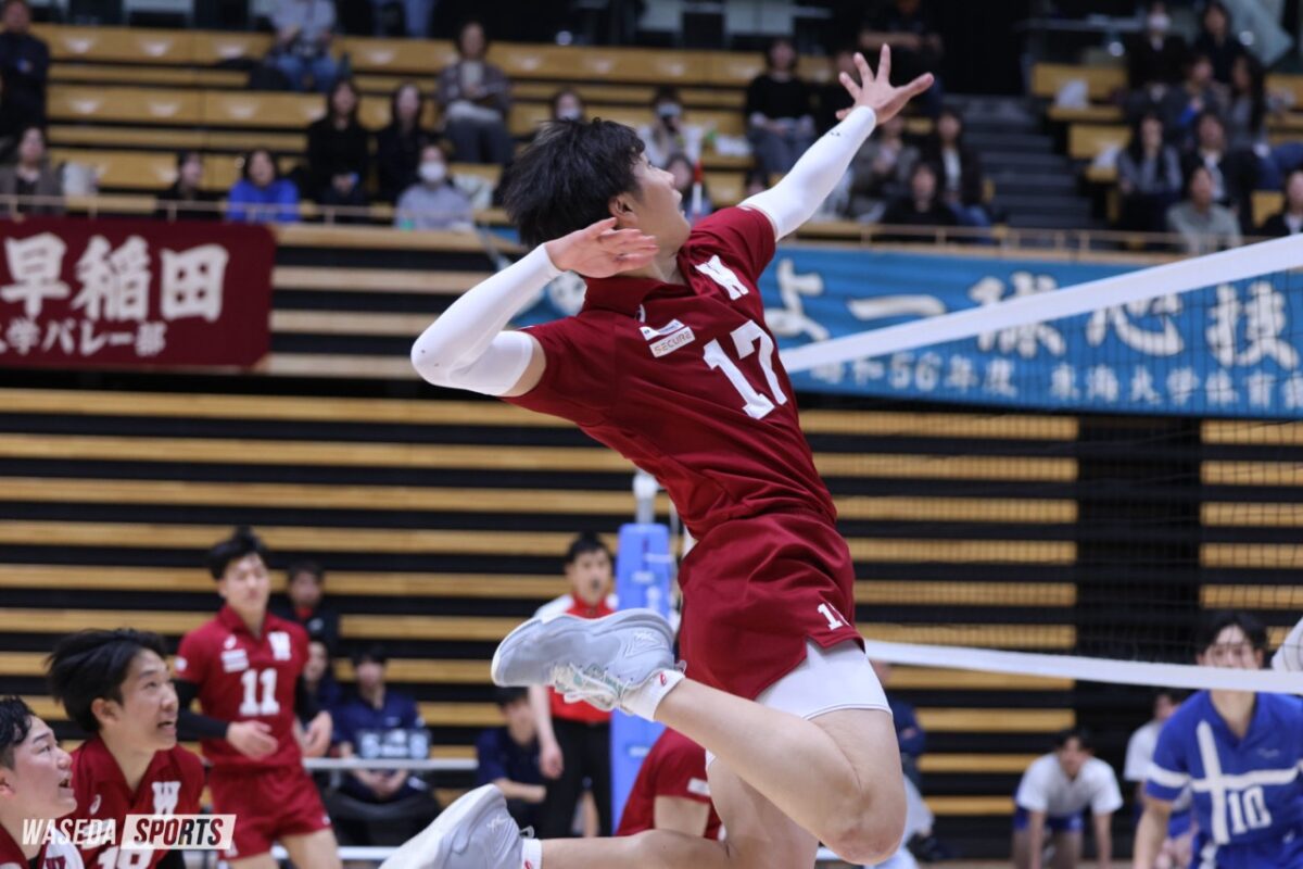 春季関東大学リーグ戦第5戦は、東海大と対戦した。1セット目は相手の攻撃的なサーブに苦しめられ、セットを落とす。2セット目は序盤からリードし、試合を優位に進める。3セット目は、一時は相手にリードを許したがラリーを取り切り逆転。4セット目は早大の勢いを取り戻し、セットカウント3-1(22-25、25-23、25-21、25-19)で勝利した。