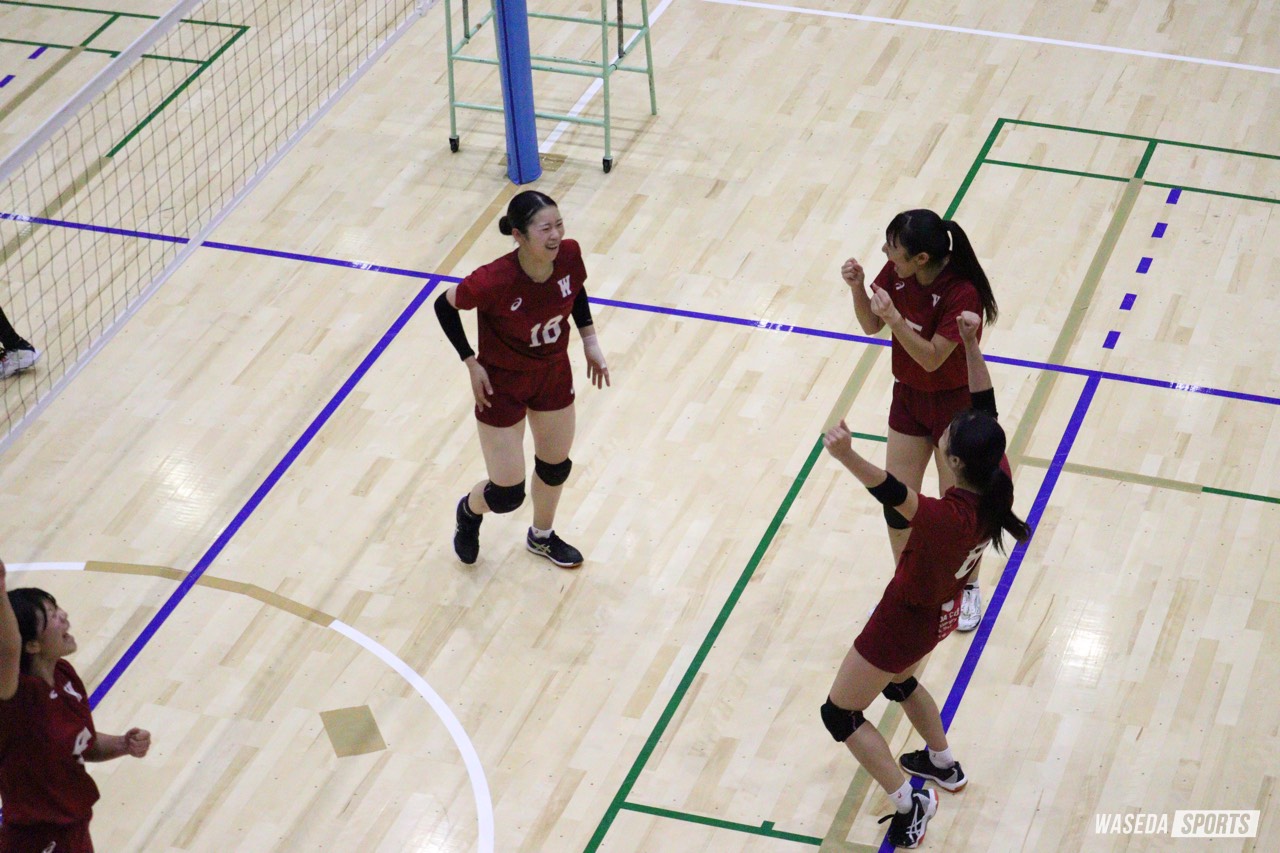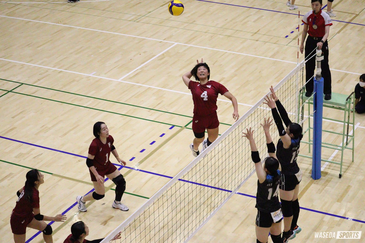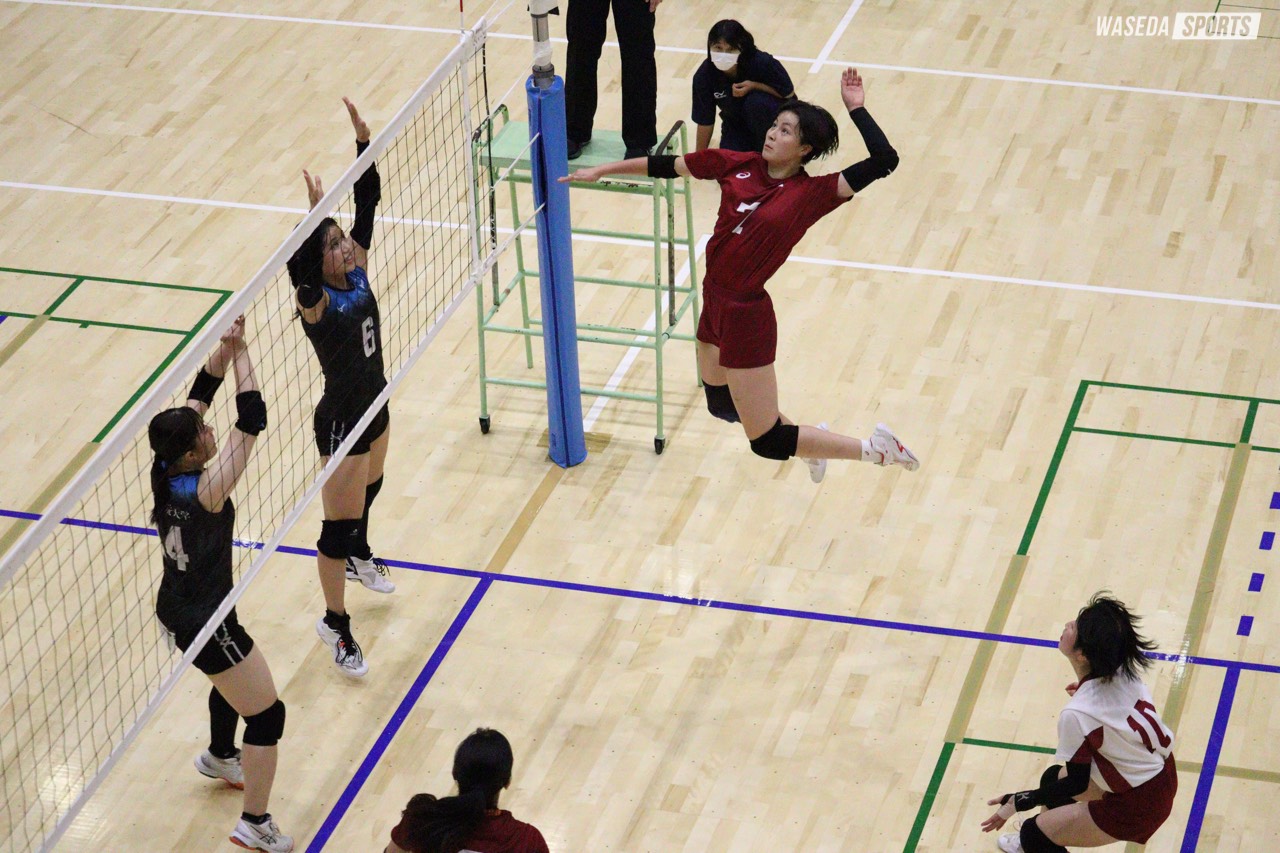 後がない第3セットは、序盤から激しい点の取り合いとなり、7ー6と好スタートを切った。相手の緩急をつけた攻撃にも何とか食らいつき、逆転されながらも2点差を追いかけ勝機を待つ。このセットで打数が特に多かった川村が連続でスパイクを決めるとチームはさらに盛り上がった。しかし、つなぎのミスなどの自滅点でじわじわと点差は広がっていき、なかなか挽回することができない。林穂乃花(スポ4=東京・国分寺)をピンチサーバーで投入して相手の守備を崩したが、逆転までは届かなかった。17ー25で第3セットも落とし、早大はストレート負けとなった。